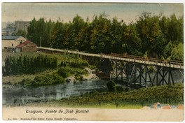 Traiguen, Puente de José Bunster [fotografía] / Carlos Brandt. Concepción : Carlos Brandt , [Entre 1899 y 1909]. 1 tarjeta postal : colotipo, fotomecánico policromo sobre papel fibra ; 14 x 9 cm. .