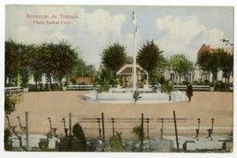Recuerdo de Temuco. Plaza Anibal Pinto [fotografía]. Chile : [Editor no identificado , 19uu], 1 tarjeta postal : colotipo, fotomecánico policromo sobre papel fibra ; 14 x 9 cm. .