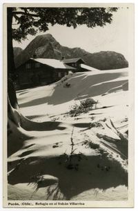 Pucón, (Chile), Refugio en el Volcán Villarrica [fotografía]. Chile : [Editor no identificado , Entre 1937 y 1947]. 1 tarjeta postal : fotografía, monocromo, gelatina sobre papel fibra ; 9 x 14 cm. .