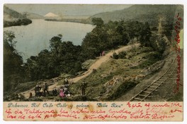Pishuinco Rio Calle Calle y volcan Villa Rica [fotografía]. Chile : [Editor no identificado] , 1905. 1 tarjeta postal : fotografía, monocromo, gelatina sobre papel fibra ; 14 x 9 cm. .