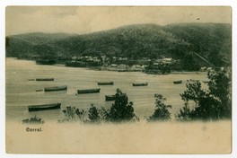 Corral [fotografía]. Chile : [Editor no identificado , Entre 1900 y 1909]. 1 tarjeta postal : colotipo, fotomecánico monocromo sobre papel fibra ; 14 x 9 cm. .