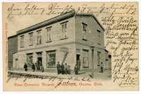 Casa Comercio Ricardo Wiederhold, Osorno, Chile [fotografía] / Ricardo Wiederhold. Osorno : Ricardo Wiederhold , 1909. 1 colotipo : fotomecánico monocromo sobre papel fibra ; 14 x 9 cm. .