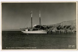 No 910 Chile Lago Llanquihue Goleta La Gaviota [fotografía] / Foto Mora. Santiago : Foto Mora , [Entre 1930 y 1940]. 1 tarjeta postal : fotografía, monocromo, gelatina sobre papel fibra ; 14 x 9 cm. .