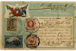 Saludo de Punta-Arenas [fotografía]. Chile : [Editor no identificado] , 1911. 1 tarjeta postal : litografía, monocromo coloreado sobre papel ; 8,5 x 6 cm. .