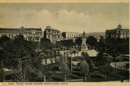 No. 83. Plaza Muñoz Gamero- Magallanes-Chile [fotografía]. Chile : [Editor no identificado, Entre 1920 y 1930] 1 tarjeta postal : colotipo, fotomecánico monocromo sobre papel ; 14 x 9 cm. .