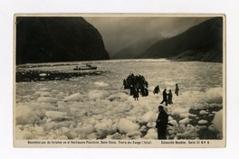 Desembarque de turistas el Ventisquero Plüschow, Seno Chico, Tierra del Fuego (Chile) [fotografía] / Handler. Punta Arenas : Handler , [1930]. 1 tarjeta postal : fotografía, monocromo, gelatina sobre papel ; 14 x 9 cm. .
