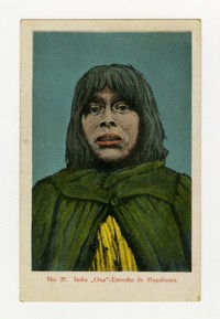 No. 27. India "Ona" - Estrecho de Magallanes [fotografía] / Librería de Marangunic y Cia. Punta Arenas : Librería de Marangunic y Cia. , [19uu]. 1 tarjeta postal : colotipo, fotomecánico policromo sobre papel de fibra ; 9 x 14 cm. .