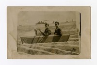 [Retrato de dos hombres jóvenes; posan con un telón de fondo que representa un paseo en lancha; en segundo plano, barcos a vapor] [fotografía]. San Antonio : [Editor no identificado] , 1 tarjeta postal : fotografía, monocromo, gelatina sobre papel ; 10 x 7,3 cm. .