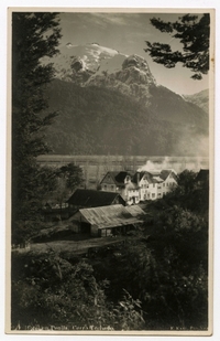 220. Hotel en Peulla, Cerro Techado. [fotografía] / E. Karl. Puerto Varas : E. Karl , [Entre 1930 y 1940]. 1 tarjeta postal : fotografía, monocromo, gelatina sobre papel fibra ; 9 x 14 cm. .