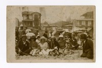 Grupo compuesto por mujeres y hombres jóvenes; en segundo plano, Casas y palacetes; un letrero anuncia "Fotografía Caruso"