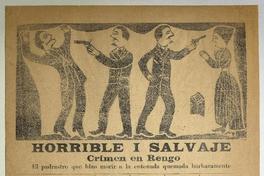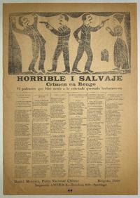 Horrible i salvaje crimen en Rengo : el padrastro que hizo morir a la entenada quemada bárbaramente / Daniel Meneses. Santiago : Imprenta América, [1905?] 1 hoja : ilustraciones ; 55 x 39 cm. .