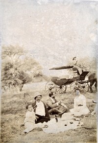 Imagen de dos hombres, una mujer y un niño sentados en el pasto con una manta, sombrero y canasto. En el fondo se visualiza un carruaje a caballo dirigido por un hombre.