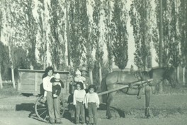 [Eliana Ponce Robles junto a sus hijos delante de una carreta tirada por caballos] [Fotografía]. Chile : [Editor no identificado] , 1953 1 Fotografía : Formato digital. .