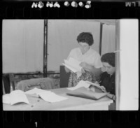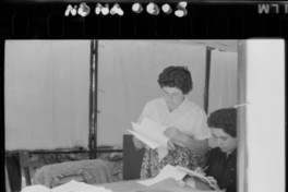 Distintas imágenes en las las que se encuentran personas realizando actividades y dos mujeres registrando antecedentes sobre la exposición [Escuela de la población callampa Costanera Casilla 12C, Concepción-Los niños de la callampa Costanera han pintado los cuadros de este recinto].