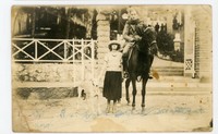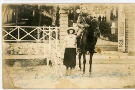 Elisa Ureta Valdés junto a Juan Casanova Vicuña y su perro, puerta principal del "Gran Hotel" de Zapallar [fotografía]. Chile : [Editor no identificado , Entre 1915 y 1920] 1 fotografía : monocromo, gelatina sobre papel fibra ; 13,2 x 8,8 cm. .