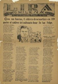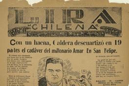Con un hacha, Caldera descuartizó en 19 partes el cadáver del millonario Amar en San Felipe. [Santiago, Chile] : [Editor no identificado], [1947?] 1 hoja : ilustraciones ; 39 x 28 cm. .
