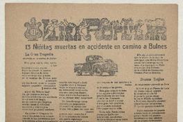 13 niñitas muertas en accidente camino a Bulnes : lira popular. [Concepción] : [Editor no identificado], [entre 1930 y 1950] (Concepción : Imprenta "El Esfuerzo") 1 hoja : ilustraciones ; 36 x 26 cm. .