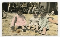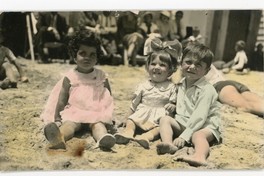 [Retrato grupal mixto de tres niños en la playa] [Fotografía]. Chile : [Editor no identificado] , 1935. 1 Fotografía : Formato digital, coloreado. .