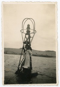 [Retrato de dos mujeres posando sobre la boya Blanco Encalada] [Fotografía]. Chile : [Editor no identificado] , [1950?]. 1 Fotografía : Formato digital, monocromo. .