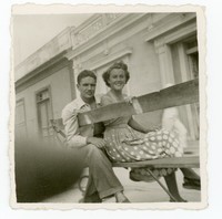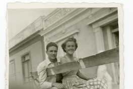 [Pareja de jovenes sentados en una banca] [Fotografía]. Chile : [Editor no identificado] , 1950. 1 Fotografía : Formato digital, monocromo. .