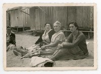 [Grupo de mujeres sentadas en la playa] [Fotografía].