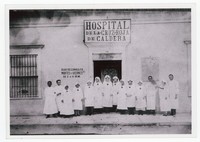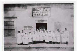 [Presidenta y socios fundadoras de la Cruz Roja de Caldera posando delante del Hospital de la Cruz Roja de Caldera] [Fotografía].