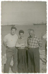 [Tres hombres de pie en la costa de Caldera] [Fotografía]. Chile : [Editor no identificado] , 1950. 1 Fotografía : Formato digital. .