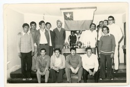 En la fotografía aparece un grupo de hombres adultos alrededor de un conjunto de trofeos.