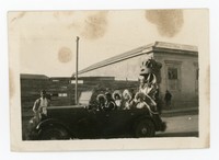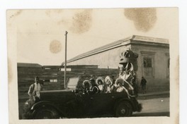 En la fotografía aparece un grupo de cinco mujeres candidatas a reinas sentadas sobre un automovil decorado, el cual es conducido por un hombre en la plaza de Caldera.