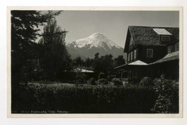 Fotografía del Hotel "Ensenada", con vista del Volacán Osorno. Tarjeta postal perteneciente al archivo de Roberto Meza Fuentes.