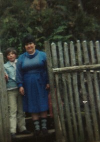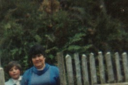 [Alfonso Cruces y Berta Muñoz tras cerco de varillas de ciprés] [fotografía]. Chile : [Editor no identificado] , 1991. 1 Fotografía : Formato digital, Policromo. .