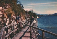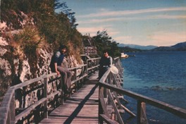En la fotografía aparecen dos hombres, no identificados, apoyados sobre las barandas de un camino, ubicado en la costanera de Caleta Tortel.