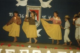 [Grupo de niños bailando en la escuela de Caleta Tortel] [fotografía]. Chile : [Editor no identificado] , 1987. 1 Fotografía : Formato digital, Policromo. .