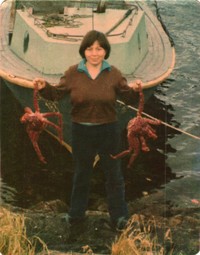 En la fotografía aparece una mujer joven en la orilla de Puerto Edén, sosteniendo con sus manos dos centollas.