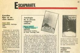 Materias: Autores chilenos - Arteche, Miguel - Edwards Bello, Joaquín - Hahn, Óscar - Cánovas, Rodrigo - Díaz, Víctor Hugo - Antología de la poesía religiosa chilena - Valparaíso, ciudad del viento - Estrellas fijas en un cielo blanco - Doble Vida