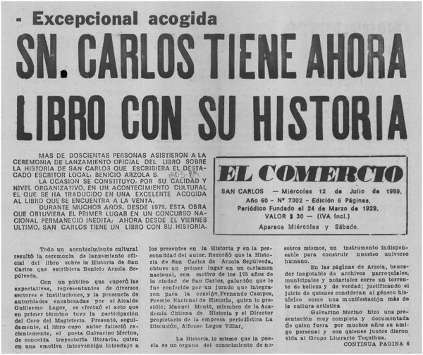 Historia de San Carlos en libro de B. Arzola [artículo] Héctor Suazo.