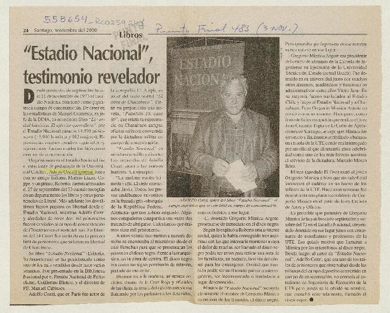 Libro sobre sucesos en Estadio Nacional [artículo]