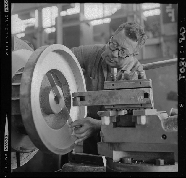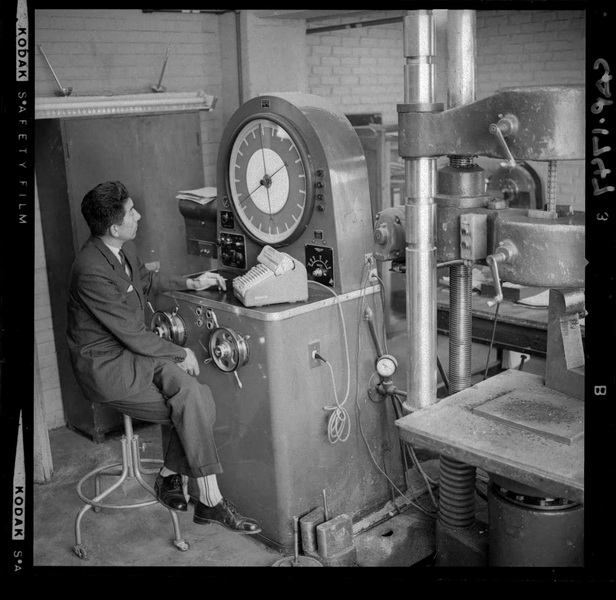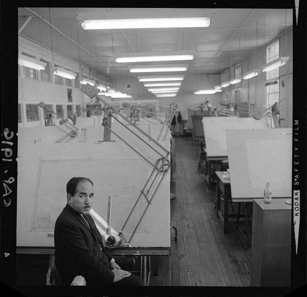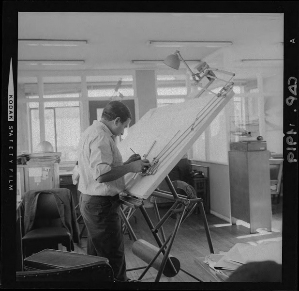 [Compañía de Acero del Pacífico : Planta siderúrgica Huachipato; Ingeniero y atril de diseño] [fotografía] Luis Ladrón de Guevara.