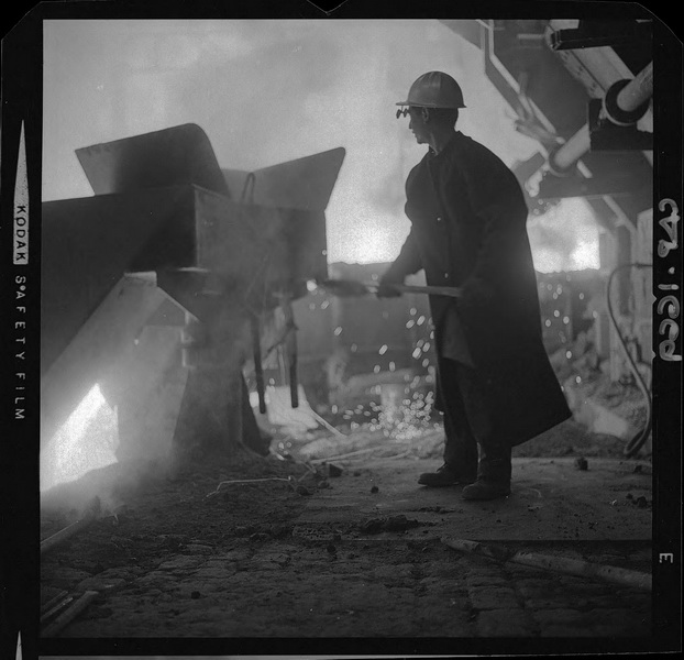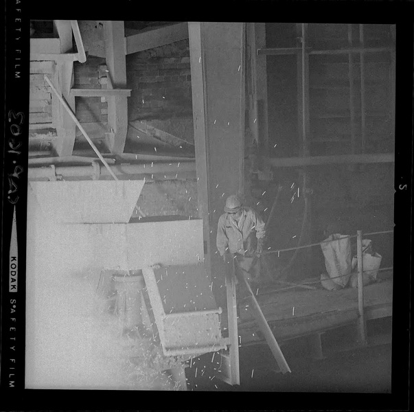 [Compañía de Acero del Pacífico : Alto Horno, fundición de acero Huachipato; trabajador en el proceso de laminación] [fotografía] Luis Ladrón de Guevara.