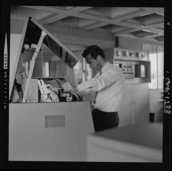 [Compañía de Acero del Pacífico : Planta siderúrgica Huachipato: Sala de procesamiento de cintas de grabación] [fotografía] Luis Ladrón de Guevara.