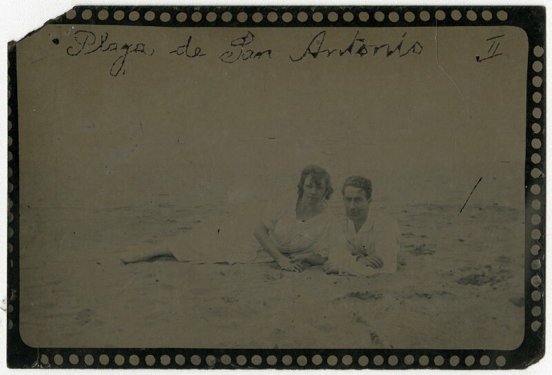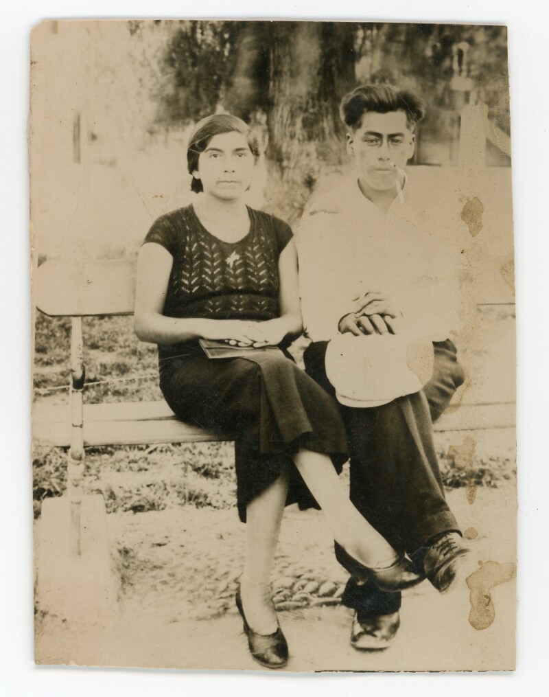 [Retrato de una pareja sentada en la plaza de Caldera] [Fotografía].