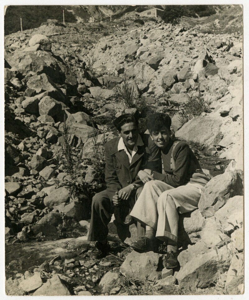 [Mujer y hombre en roquerío de las Termas de Chillán] [fotografía].