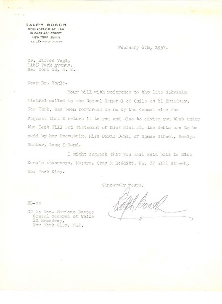 [Carta] 1957 feb. 6, New York [a] Dr. Alfred Vogl, New York [manuscrito] Ralph Bosch.