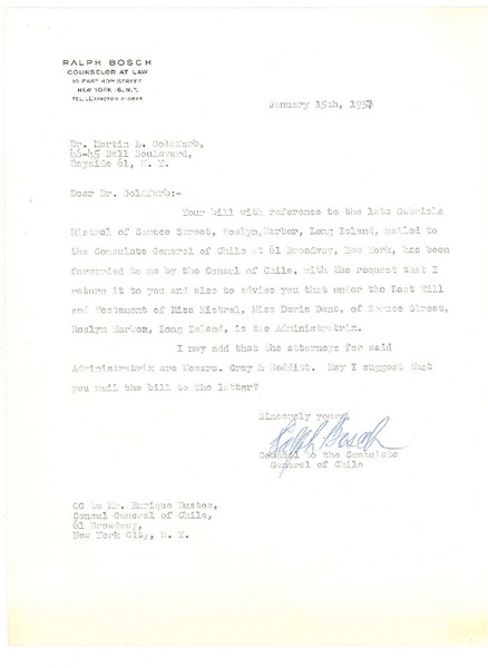[Carta] 1957 jan. 15, New York [a] Dr. Martin L. Goldfarb, New York [manuscrito] Ralph Bosch.