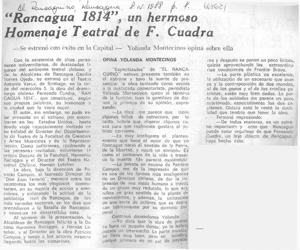 "Rancagua 1814", un hermoso homenaje teatral de F. Cuadra [artículo] Yolanda Montecinos.