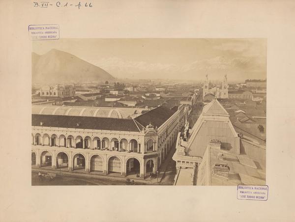 Santiago Plaza de Armas con la Intendencia : [Palacio del Gobernador (Correo Central), Palacio de la Real Audiencia y Cajas Reales (Museo Histórico Nacional de Chile), y el Cabildo Colonial (Municipalidad de Santiago); en segundo plano, se observa la cúpula del Cuartel General del Cuerpo de Bomberos de Santiago, calle Santo Domingo esq. Puente. Monumento "A La Libertad de América" o a "La Victoria de Ayacucho", emplazado en el centro de la Plaza]...