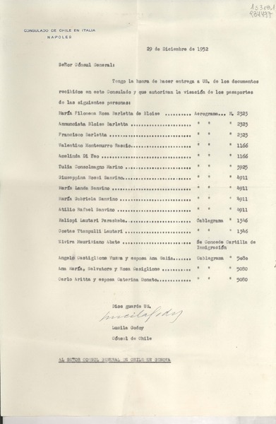 [Memorandum] 1952 dic. 29, Nápoles, Italia [al] Señor Cónsul General de Chile en Génova, [Italia] [manuscrito] Lucila Godoy, Cónsul de Chile.