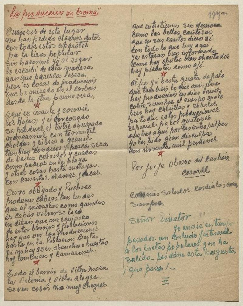 La producción en broma [manuscrito] por Jorge Obrero del Carbón.