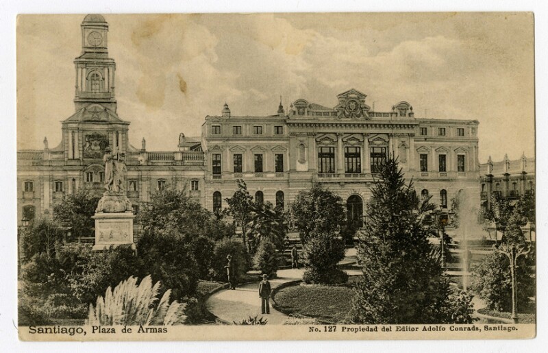 Plaza de Armas (Santiago, Chile) - Arquitectura colonial - Arquitectura del paisaje - Santiago - Escultores - Tarjetas postales - Edificios históricos - Monumentos - Chile - Fotografías - Rosales Larraín, Francisco Javier - Municipalidad de Santiago (Chile) - Museo Histórico Nacional (Santiago, Chile) - Orsolino, Francisco - Santiago (Chile : Ciudad) - Historia