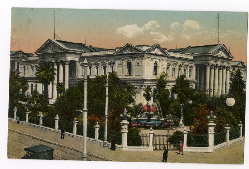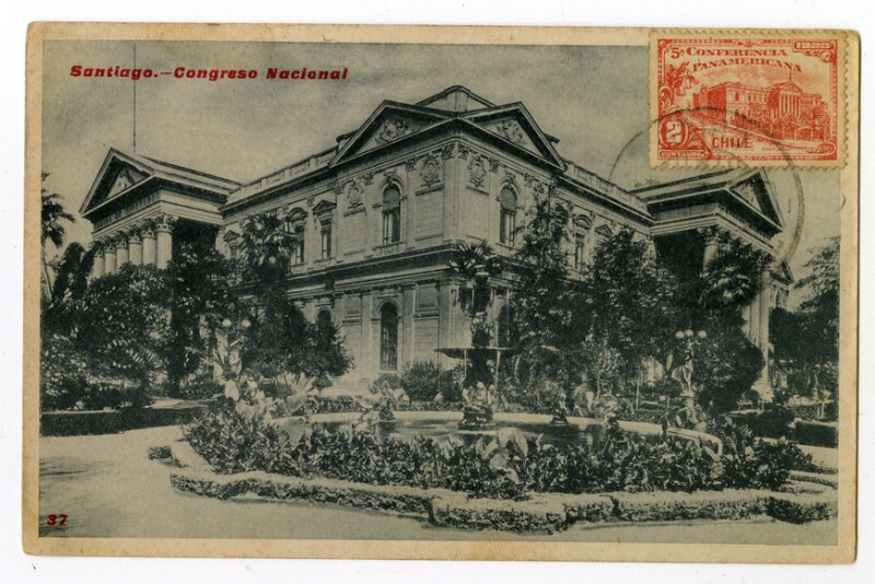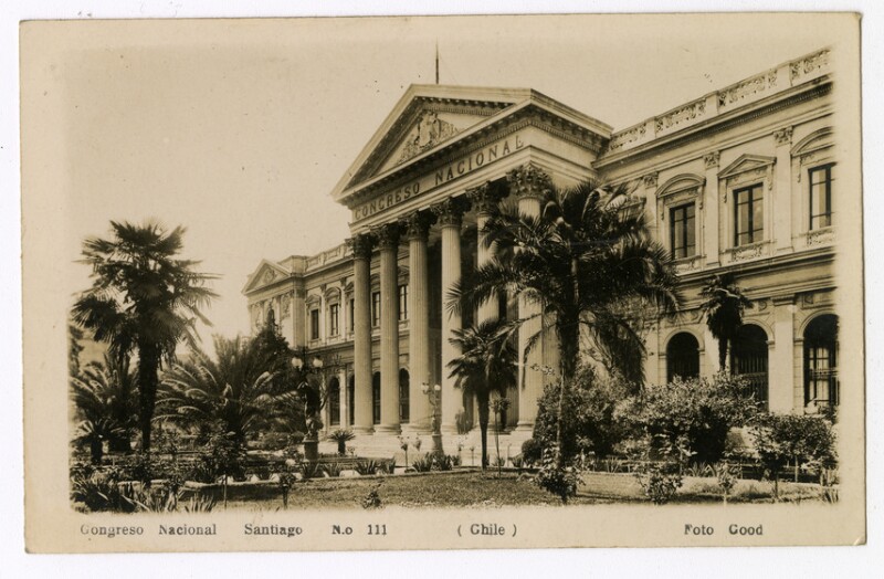[Edificio del ex Congreso Nacional, rodeado del gran jardín y entrada a la Cámara de Diputados, Santiago de Chile] [fotografía].